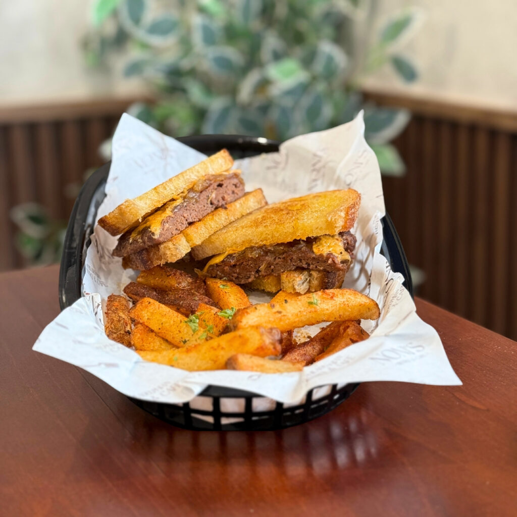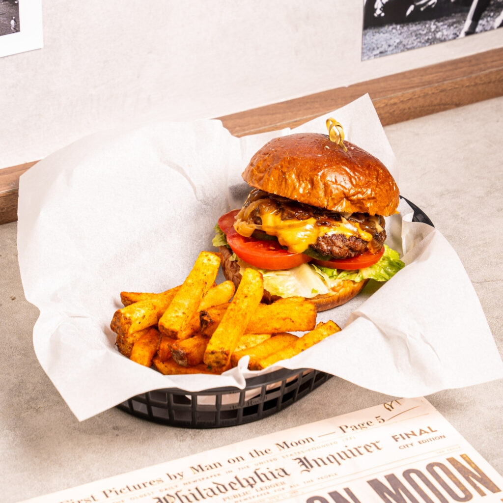 Homemade Sourdough Bread, Homemade Beef Patty, Cheese, Caramelized Onion, Hand-cut Fries